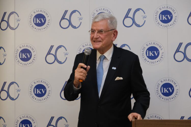 İKV’nin 60’ıncı yılını kutlaması vesilesiyle bir konuşma gerçekleştiren AB eski Bakanı ve Başmüzakereci Büyükelçi Volkan Bozkır, yarım asrı aşan birikimi ile Türkiye-AB ilişkilerine sunduğu katkılardan dolayı İKV’ye teşekkürlerini sundu. Başmüzakereci olarak görev yaptığı yoğun diplomasi dönemine atıfta bulunan Büyükelçi Bozkır, Türkiye’nin o süreçte AB müktesebatına uyum yolunda sergilediği hıza ve kararlılığa dikkat çekti. Konuşmasında AB perspektifinin Türkiye için stratejik değerini hâlen koruduğunun altını çizen Büyükelçi Bozkır, geçici zorluklara rağmen ana hedefin değişmemesi gerektiğini ve bu hedefin tartışmasız bir şekilde tam üyelik olduğunu vurguladı. Etkinlikte, Vakfın kuruluşunun 60’ıncı yılı dolayısıyla bir pasta kesildi.